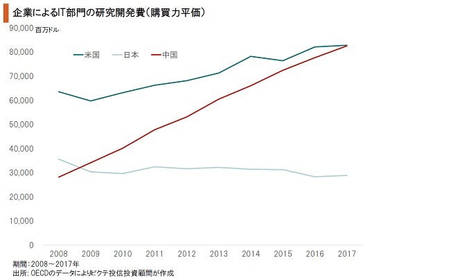 企業によるIT部門の研究開発費は、購買力平価ベースで2017年に米中が並んだ。一般的には、R&Dの成果は投じた費用に比例するため、米国は競争力維持の観点から看過できない状況と言える。特に、中国は国営企業が各産業の中軸を占めている。米国としては、公正な競争条件とする上で、官民を挙げて中国に対し是正を求めざるを得ないだろう。
