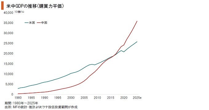 2019年における中国の名目GDPは14兆3,430億ドルであり、米国の21兆4,330億ドルに対して3分に2だった。しかしながら、IMFによれば、購買力平価ベースだと2017年に中国の経済規模は既に米国を上回り、その差は開く傾向にある。人口が異なるため、2020年時点での中国の国民1人当たりのGDPは購買力平価ベースでも米国の4分の1強に過ぎない。ただし、規模の面における中国の成長は著しいものがあると言うべきだろう。