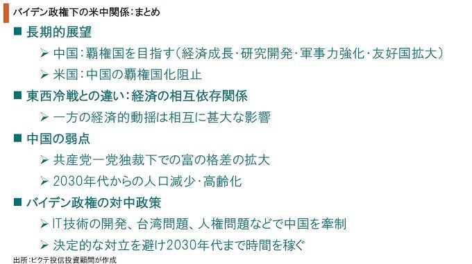 長期的に考えれば、中国は覇権国化を目指し、米国はそれを阻止しようとする時代に突入したと言える。これは、世界を2つのブロックに分断する力だが、米ソ冷戦との違いは米中両国の相互依存関係ではないか。中国経済の規模は極めて大きく、その動揺は米国を含めて世界経済に大きな影響を与えることになりかねない。バイデン政権は、中国の人口減少・高齢化が本格化する2030年代まで、中国の力が強くなり過ぎないよう手を打つことが予想される。それは、米中の決定的な対立を避けつつ、時間を稼ぐ道を選ぶ道と言えそうだ。