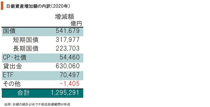 昨年、日銀の資産残高は過去最大となる129兆5.291億円増加した。このうち国債は54兆1,679億円だが、短期国債が31兆7,977億円を占めている。政府が第1次、第2次補正予算の財源として短期国債を大幅増発したことに対応した動きだろう。また、新型コロナ禍の下で企業への金融支援に乗り出したことにより、CP・社債が5兆4,460億円、貸出金が63兆60億円増加した。ETFについては、簿価ベースで7兆497億円を積み増している。