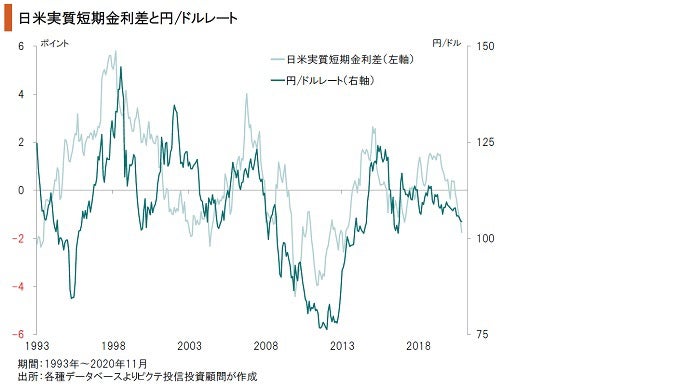 ファンダメンタルズから見た場合、日米の実質金利差が為替の重要な決定要因だろう。足下、インフレ連動債と10年国債の利回りから算出される米国の期待インフレ率は2%程度であり、従って実質金利はマイナスだ。一方、日本のCPIはマイナスである。畢竟、日米の中央銀行が共にゼロ金利政策を採用しても、日本の実質短期金利が高いことから円高になり易い。