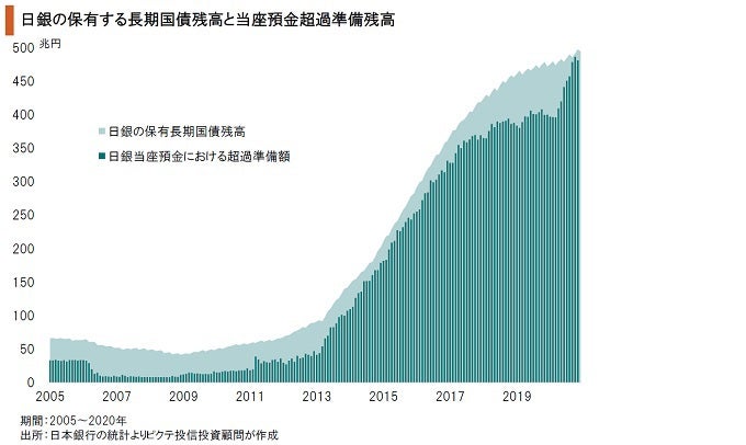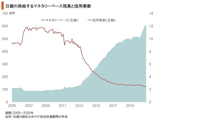 QQEを支える理屈は、中央銀行が物価目標を明確にし、その実現へ向け十分な量的緩和を実施すれば、インフレ期待の高まりから消費・投資が喚起され、物価目標が実現する・・・との考えだ。その前提は信用乗数の安定だろう。しかしながら、QQE開始直前に8.50だった信用乗数は、2020年末には2.44へと低下した。マネタリズムは機能していないようだ。
