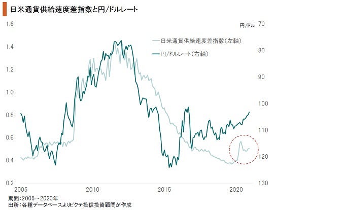 円/ドル相場に影響する要因の1つは、日米の通貨供給速度の違いにあることが経験的に示されている。リーマンショック以降、FRBが量的緩和を強化、ドルの供給速度は円を大幅に上回り、ドル安・円高が進んだ。日銀がQQEを採用した当初は、こうした流れを変え、為替を円安方向へ加速させる重要な要因になったと考えられる。