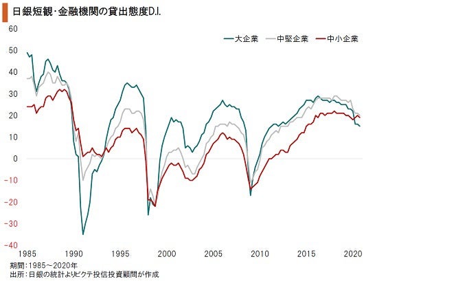 日銀短観の金融機関の貸出態度D.I.を見ると、新型コロナ禍の下でも高い水準を維持している。これは、消費や投資が伸びず、物価上昇率が2%に達しない理由が、金融面での量の不足ではなく、別の要因によるものであることを示す傍証に他ならない。従って、日銀がQQEでマネタリーベースを大幅に増加させても、実需にはつながらないのだろう。