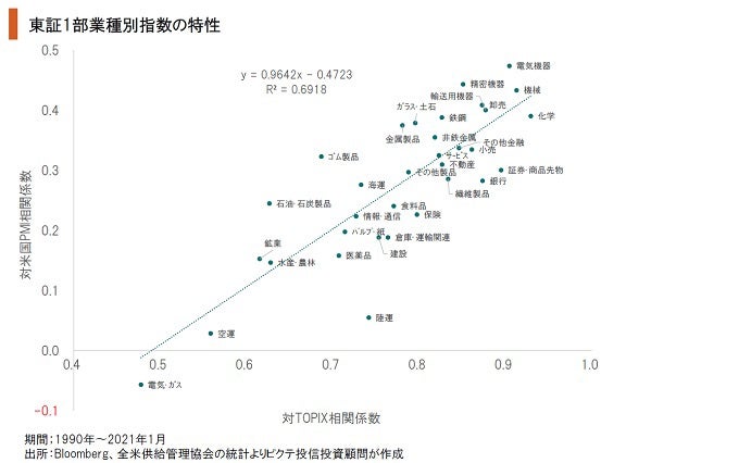 東証1部業種別指数に関し、対TOPIX、対米国PMIの相関係数を横軸、縦軸にとると、米国景気への連動性が高い東京市場の場合、各業種を対象とした一次回帰直線は右方上がりとなる。今後も金融緩和が続く一方、PMIの一段の上昇がないとすれば、日本株ポートフォリオでは、地球温暖化関連などの成長株と共に、内需系ディフェンシブのウェートを上げるべきだろう。