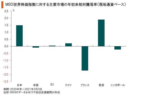 MSCIの世界株価指数に対し、日本株は2018年から昨年まで3年連続でアンダーパフォームした。しかしながら、昨秋以降、東京市場は好調に推移、今年に入ってからは世界指数をアウトパフォームしている。欧州では、ドイツが小幅ながらアウトパフォームする一方、フランス市場は大幅なアンダーパフォームで、新型コロナの感染状況が株価の明暗を分けようだ。
