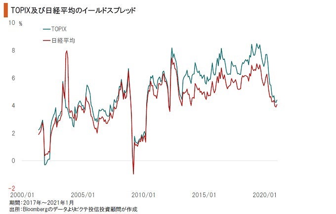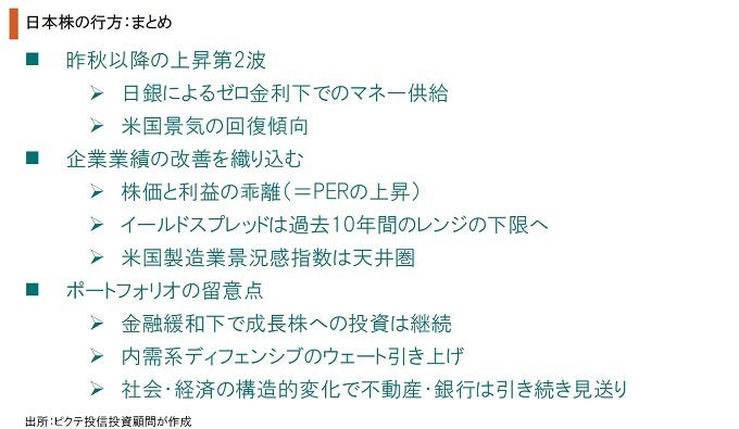 新型コロナ禍による急落後の日本株の上昇局面は、昨秋より第2段階に入った。背景には、日銀による歴史的な金融緩和に加え、米国景気の回復傾向があるだろう。ただし、市場が企業業績の改善を先取りした結果、予想PERが上昇し、イールドスプレッドは過去10年間のレンジの下限まで低下した。米国PMIが既に高値圏にあることを考えれば、東京市場の上昇局面も取り敢えずは一段落するのではないか。そうしたなか、日本株のポートフォリオとしては、環境関連など成長株を組み込むと共に、内需系ディフェンシブのウェートを上げる局面だろう。