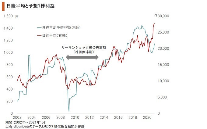 2000年代に入り日経平均と予想EPSは強く連動してきた。従って、過去10年間における平均の予想株価収益率(PER)17.45倍に対し、標準偏差は2.45と小さい。ただし、新型コロナ禍が深刻化して以降、歴史的な金融緩和により市場のリスク許容度が拡大、資産価格を押し上げている。日経平均とEPSの動きにも乖離が生じ、1月末の予想PERは24.20倍へ上昇した。