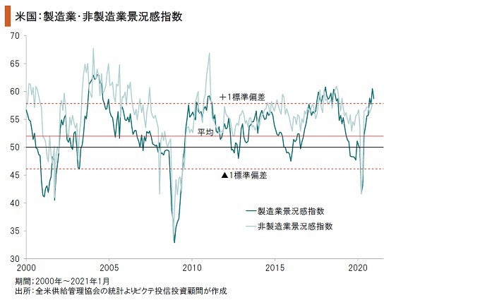 今後の日本株を考える上で、米国のPMIは引き続き重要な指標だ。1月のPMIは前月比1.8ポイント低下の58.7だった。1980年以降、平均52.0、標準偏差5.8であり、平均から±1標準偏差を超えたレベルは概ね天井圏・ボトム圏である。現在はそのレンジを上に抜けており、PMIは天井圏にあると考えられる。東京市場の上昇一段落が近づいているシグナルなのではないか。