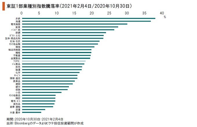 現在の上昇相場の起点である昨年10月30日から2月4日までの東証1部業種別指数の騰落率を見ると、非鉄、海運、電気機器などが市場をアウトパフォームしている。一方、水産・農林、空運、倉庫・運輸、食料品などはアンダーパフォームだ。景気敏感セクターが買われると共に、各業種に対する新型コロナの影響が反映されたと言えるだろう。