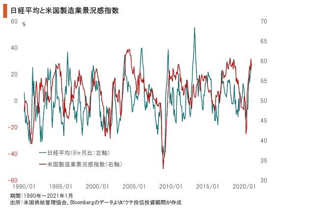 1990年代初頭のバブル崩壊以降、日本株は米国の製造業景況感指数(PMI)に概ね連動する傾向がある。一方、PMIは米国景気の方向をタイムリーに示す傾向が強い。つまり、日本株は米国経済の動向を反映する景気敏感市場と言えるだろう。新型コロナの特殊要因の下ではあるが、足下の東京市場の上昇は、伝統的な日本株の特性によると考えられる。