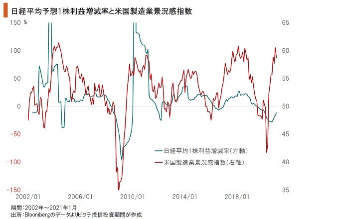 日本株が米国のPMIに連動する背景は、ファンダメンタルズの要因と考えられる。日経平均の1株利益(EPS)の増減率は、米国のPMIのトレンドを反映するからだ。例えば、製造業で稼ぎ頭の自動車産業の場合、主な収益の源泉は日本国内ではなく米国である。従って、PMIは上場企業の利益のベクトルを推測する上で非常に重要なデータと言えるだろう。