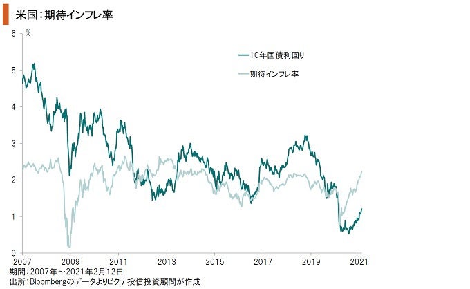 米国のインフレ連動債と10年国債の利回りから算出した市場が織り込む期待インフレ率は、足下、2.2%に達している。約8年ぶりの水準だ。新型コロナの下で大型の財政政策が採られた結果、リアルな経済で需要が喚起されると共に、量的緩和による通貨価値下落の観測が相乗的に機能しているのだろう。これは、資産市場への資金流入の背景と考えられる。