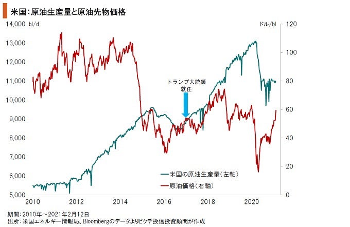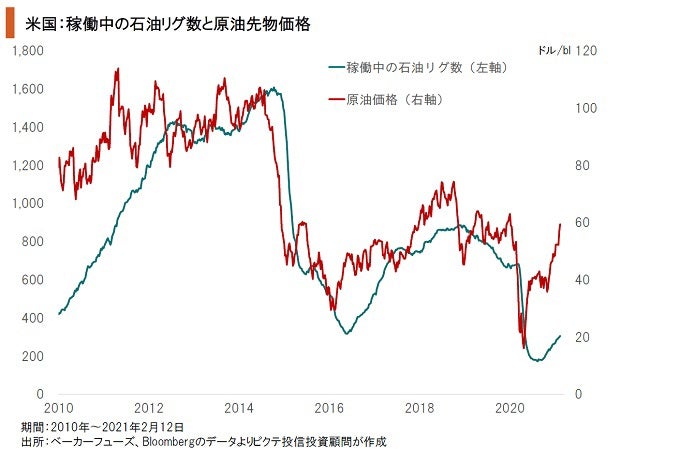 米国市場においてWTI原油先物価格が1年2ヶ月ぶりに1bl=60ドル台となった。新型コロナ禍収束への観測、そして主要中央銀行による金融緩和が、マーケットの期待インフレ率を高めていることが背景だろう。また、昨年の原油価格の急落を受け、米国のシェール・オイルが大幅な減産に追い込まれた結果、世界の原油需給が引き締まっていることも理由と言える。過去10年間、世界で唯一原油生産量を顕著に増加させたのは米国のみであり、米国の石油事業者の動向が国際市況に与える影響は極めて大きくなった。シェール・オイルの減産で米国内における在庫水準の調整が進み、価格の下落圧力が緩和されたことは明らかだ。もっとも、原油価格の上昇局面は取り敢えず一巡する局面が近付いているのではないか。原油の市況は世界の名目成長率と連動する傾向があり、2021年は景気の回復が見込まれている。一方、シェール・オイルの特徴の1つは、短期間に生産を再開できることだ。既に米国において稼働中のシェール・オイルのリグ数は底入れしており、価格が上がればさらに生産量が増えるだろう。結果として、リバウンド一巡後、原油価格は安定基調となることが予想される。