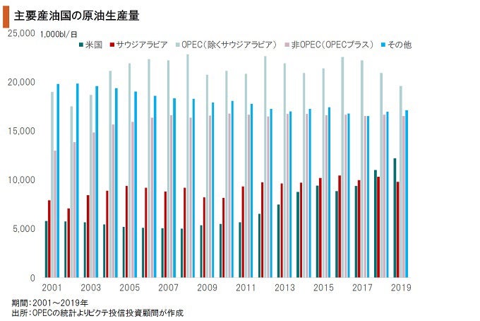 現在の国際石油市況は、米国におけるシェール・オイルが左右していると言っても過言ではない。理由は、過去10年間、多くの産油国で生産量が横這い、もしくは減少するなか、米国のみ日量700万bl以上の増産を実現したからだ。米国の場合、個々の民間事業者が生産量を判断し、統制的手法を採っていないことも価格を大きく振幅させる要因と言えよう。