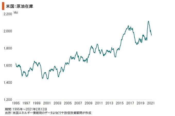 昨年7月、新型コロナ禍による需要の急減を受け、米国の石油在庫は21億1,764億blに達した。適正水準は20億bl以下と言われるなか、この過剰在庫が原油価格を下落させる要因の1つだったと言えるだろう。その後、シェール・オイルの減産により、在庫水準は20億bl割れとなった。在庫調整の進捗は、原油価格の安定に貢献していると見られる。