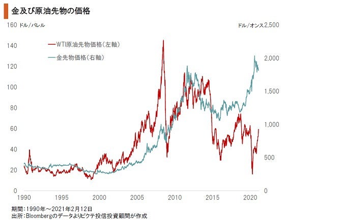 2019年に入って金の価格が大きく上昇したのは、中長期的な通貨価値の下落リスクに対するヘッジだろう。一方、原油は、シェール・オイルの増産、新型コロナ禍による需要の低迷で需給バランスが崩れ、昨年前半は価格が大幅に下落した。しかし、期待インフレ率の上昇に沿ってリバウンド局面を迎えている。商品市況全般の流れを受けた動きと言えそうだ。