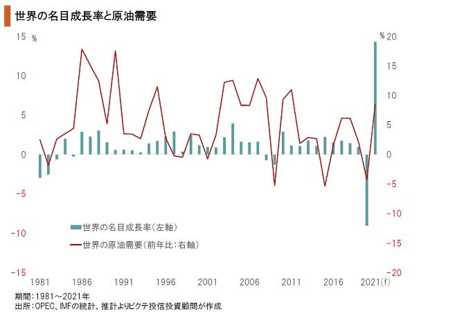原油需要は、概ね世界経済に連動して推移する傾向がある。IMFによれば、昨年、世界の名目成長率は新型コロナ禍により2015年以来5年ぶりのマイナスになった(▲4.2%)。それが、需要面から原油の需給バランスが崩れた背景だ。2021年については、IMFは8.6%の名目成長を見込んでいる。原油需要は既に回復期に入ったと言えるだろう。
