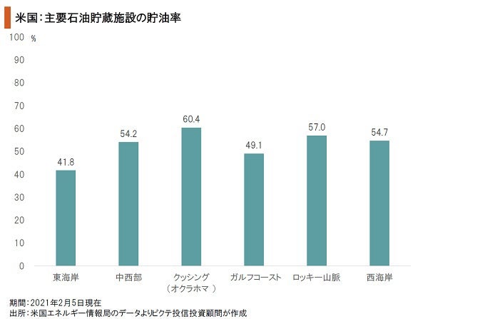 2020年の米国原油先物市場では、同年5月限が取引最終日となった4月20日に▲40.32ドルまで下落した。最終決裁で現物受け渡しとなるWTI先物において、受け渡し場所であるオクラホマ州クッシングの石油貯蔵量が限界に達したとの観測が背景だった。足下、米国の主要貯油施設には余裕があるため、そうした混乱が再び起こる可能性は極めて少ないだろう。