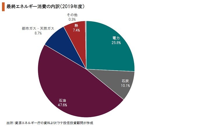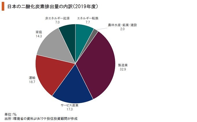 日本の場合、温室効果ガスの中心である二酸化炭素の排出量は、製造業が全体の32.9%であり、運輸18.7%、サービス産業17.3%と続く。企業部門に関しては、制度設計により温室効果ガスの排出量を抑制するのは相対的に難易度が低い。一方、CO2排出量14.3%を占める家庭は、政治的にも規制が難しく、畢竟、川上における脱炭素化が重要となる。