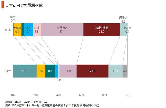 再エネ先進国であるドイツの国土は日本とほぼ同規模だが、可住地が66.7%に達する。従って、耕作地が国土の34.2%を占め、バイオマス燃料が豊富だ。また、北部のバルト海、北海沿岸は風力発電の適地である。その結果、2019年におけるドイツの電源構成では、風力20.7%、バイオマス8.3%、計29.0%に達した。一方、太陽光は7.6%に留まっている。