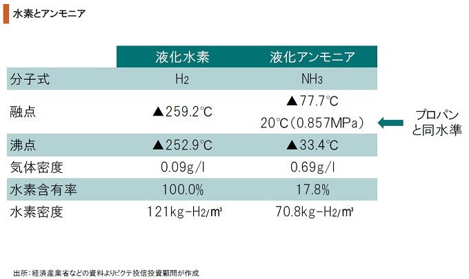 水素は融点が▲259.2℃と極めて低いため、液化のコストが問題となる。また、水素は爆発のリスクが高い。そこで、水素から融点の高いアンモニアを生成し、液化して運送する方法が現実味を帯びる。アンモニアは、プロパン並みの気圧で常温でも液化し、エネルギー密度が水素に比べて高い。水素からのアンモニア生成が難しい技術を要しないことも利点だ。