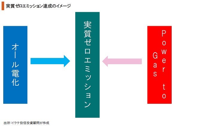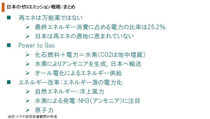 最終エネルギーを「オール電化」した上で、再エネ、水素、原子力により発電を行えば、理屈の上では実質ゼロエミッションが達成される。その場合、コストの抑制が極めて重要だ。また、”Power to Gas”に関しては、化石燃料から水素を生成する過程で生じるCO2を地中に埋設するためのインフラ及び水素のサプライチェーンを確立しなければならない。