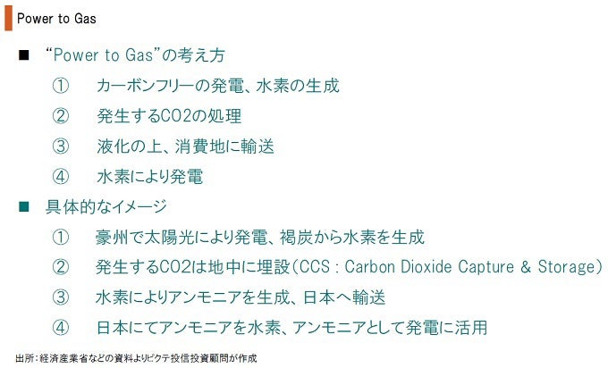 再エネの活用に限界のある日本では、”Power to Gas”が注目される。再エネに適し、化石燃料資源の豊富な国・地域で電力により化石燃料から水素を生成、それを液化して日本に運ぶ方法だ。日本で水素による発電を行えば、脱炭素の電力供給が可能になる。つまり、水素を運送手段とすることで、需給の時間的・空間的一致が必要な電力の課題を解消する方法だ。