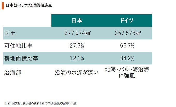 日本の国土はドイツよりやや広い。ただし、可住地比率は27.3%であり、耕地面積は12.1%に留まる。また、日本沿海は水深が深く、着床式洋上風力には向かない。結果として浮体式になるが、コストが高く高波時の復元性喪失など課題がある。つまり、再エネ先進国と言われるドイツと比べ、日本は再エネの適地が少なく、発電比率の引き上げには限界があるだろう。