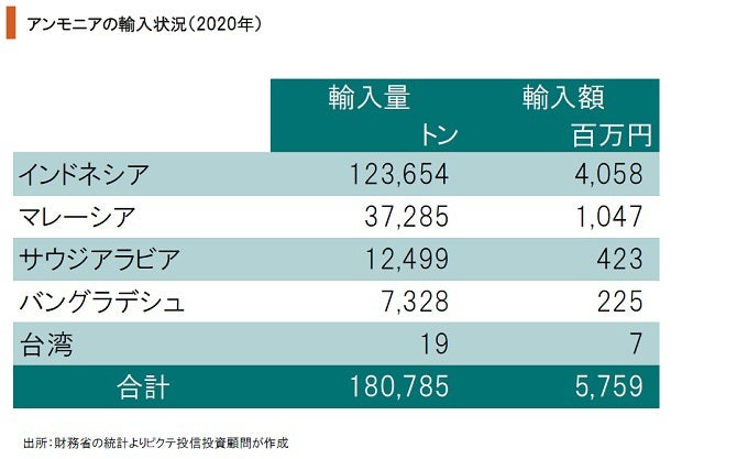 アンモニアは毒物及び劇物取締法によって劇物指定されているものの、農業用肥料として日本国内で使われており、2020年は18万トンがインドネシア、マレーシアなどから輸入された。つまり、大規模な輸送や貯蔵の技術は既に確立されている。ただし、水素と比べてアンモニアは着火し難く、火の回りが遅いため、火力発電の燃料として使用するには工夫が必要だろう。