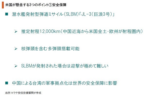 米国が特に懸念しているのは、台湾情勢だろう。その理由として3点が考えられる。第1には安全保障上の観点だ。中国が開発中のSLBM「JL-3」は射程が1万2千kmと想定される。つまり、台湾海域周辺から米国全土、欧州全域への攻撃が可能だ。台湾が中国により軍事拠点化された場合、潜水艦の追尾が難しくなるため、米国にとっては大きな脅威となり得る。