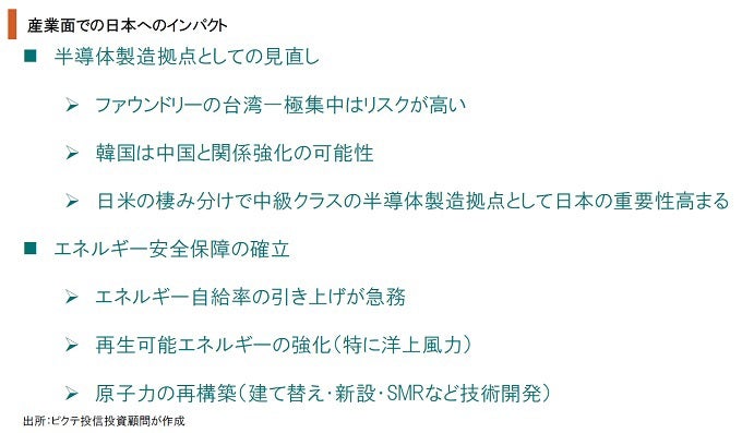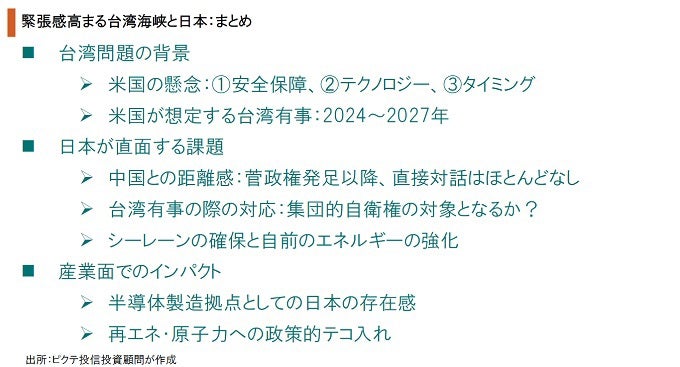 台湾を巡り米中間の緊張感が高まる場合、日本の経済・産業にも大きな影響が生じると想定される。日本にとっての追い風は、半導体製造に関して台湾一極集中への懸念が強まり、日本が中級クラスの製造拠点として再評価される可能性のあることだ。また、シーレーンの不透明感を考えれば、日本政府は再エネ、原子力などエネルギーの自給力を強化するだろう。