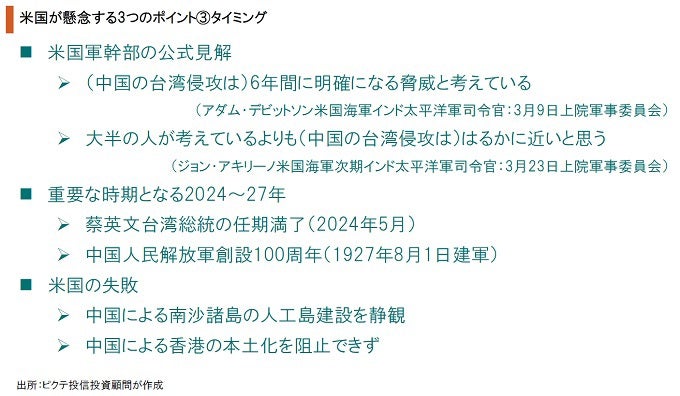 第3はタイミングだ。2024年5月、独立志向の強い蔡英文台湾総統が任期満了になる。一方、2027年は中国人民解放軍の建軍100周年で、何等かの歴史的成果を模索する可能性は否定できない。南沙諸島での人工島建設、香港への直接介入を止められなかった米国としては、2024~27年に中国が台湾に関して行動を起こす可能性を懸念しているのではないか。