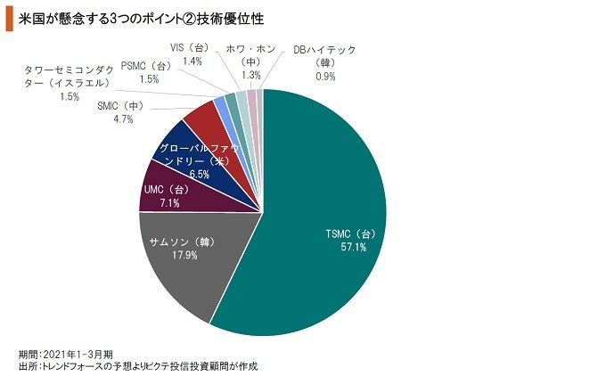 第2の懸念はテクノロジーだ。半導体の微細化技術に関して、中国最大のファウンドリーである中芯国際集成電路製造(SMIC)は、台湾積体電路製造(TSMC)に2世代遅れていると言われている。中国が台湾企業の持つ半導体製造技術を手に入れた場合、それは中国のデジタルIT技術が世界最先端になることを意味し、米国の技術的覇権が失われかねない。