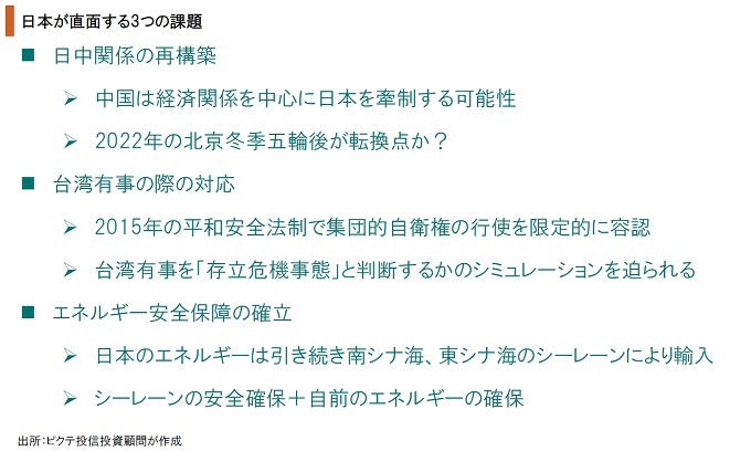 台湾を巡り米中対立が激化するなか、日本は3つの課題に直面するだろう。それは、1)経済を中心とした中国との距離感、2)台湾有事の際の日本の対応(存立危機事態として集団的自衛権を発動するか)、3)南シナ海、東シナ海におけるシーレーンの確保だ。日米首脳会談を終えた菅首相だが、米中両国間における日本のバランスの採り方は未だ示していない。