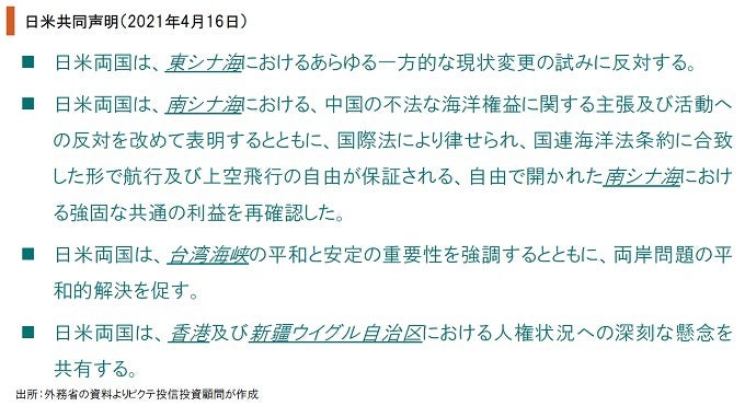 4月16日に行われた菅義偉首相とジョー・バイデン大統領による初の日米首脳会談は、東アジアにおける中国の行動を強く牽制する結果だった。特に台湾情勢を巡る米国の危機感が明確になったと言えよう。中国人民解放軍が2027年に建軍100周年を迎えることから、米国は中国が今後6年間に台湾へ直接介入する可能性を懸念している模様だ。その場合、台湾が中国の基地化することで安全保障上のバランスが大きく変化する上、IT技術の開発において中国の競争力が飛躍的に高まると想定されるからだろう。南沙諸島の人工島建設、香港への直接介入を止められなかった米国は、台湾の実質的な独立維持に強く関与する意向と見られる。菅政権としては、「自由で開かれたインド太平洋構想」の下、価値観の共有と安全保障上の協力で米国と同盟関係の強化を目指す見込みだ。もっとも、経済的な関係の深まる中国との距離感は不透明で、中国は日本への経済的締め付けを強化する可能性があるだろう。一方、産業面では、台湾一極集中へのリスク回避のため、日本が半導体製造拠点として見直されるのではないか。また、再エネ、原子力など自前のエネルギー強化も重要課題と言える。