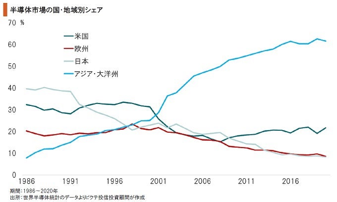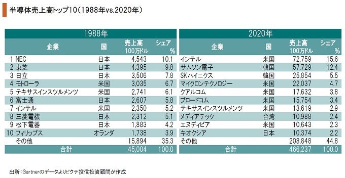 1988年、日本企業の半導体売上高のシェアは50.3%に達しており、世界トップ10の6社を占めていた。この状況は、米国の強い反発を招いて外交問題化した結果、1986年に日米半導体協定が締結され、1991年に改訂されたのである。総合電機メーカーである日本の半導体企業は、米国との摩擦による多様な製品群への報復を恐れ、事業の拡大を躊躇った。これが、日本の半導体が地盤沈下する要因の1つと言えるだろう。ちなみに、2020年、日本企業で売上高トップ10に入ったのは、NAND型フラッシュメモリを製造するキオクシアだけである。