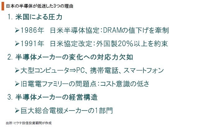 日本の半導体が低迷した理由は、米国からの外圧に加え、日本企業による戦略の失敗が大きい。特に、大型コンピューターからPC、携帯電話、スマートフォンへの流れにおいて、メモリ中心からロジックICへの移行が遅れた。さらに、総合電機メーカーの1部門であるため、市況悪化時において、研究開発や設備投資に大胆な資金投入ができなかったことも要因だろう。
