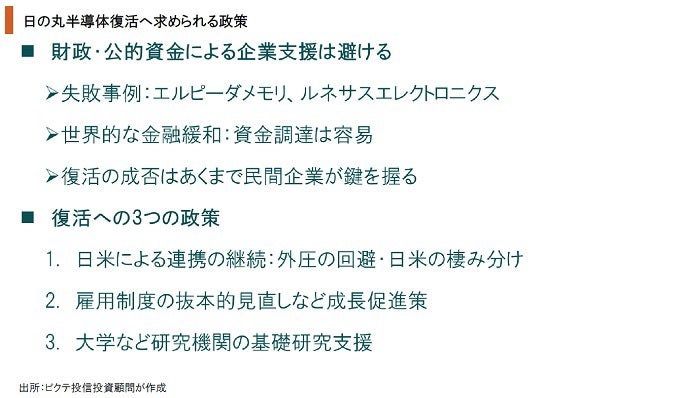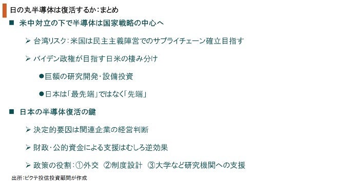 米国主導のサプライチェーンでは、最先端の半導体をインテルなど米国企業が担うことになろう。もっとも、半導体は研究開発・設備投資に巨額の費用が必要であり、米国企業だけでは荷が重い。そこで、かつては半導体市場の40%以上を握り、現在も部材や製造装置で強い競争力を維持する日本について、米国は供給網構築のパートナーと考えている模様だ。