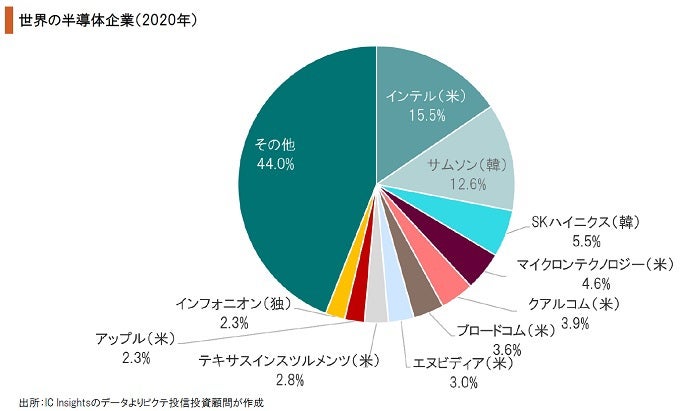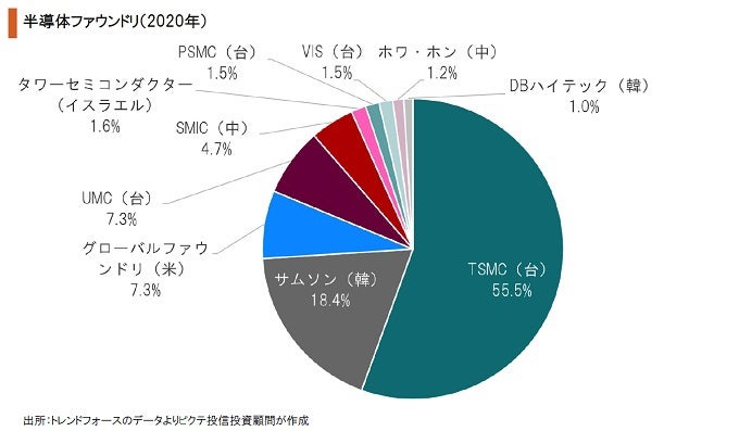 世界の半導体業界では、インテルのシェアが16%に達するなど、米国勢が総売上高の50%以上を占めている。もっとも、多くの米国系企業はファブレスであり、設計とマーケッティングに特化してきた。特に回線幅10ナノメーター以下の最先端品については、製造を専業とするファンドリが多くを供給している。その規模は全半導体売上高の20%程度に達する模様だ。