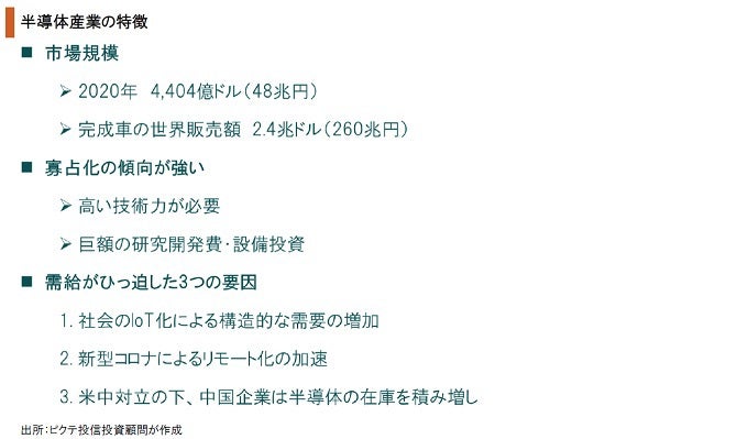 マーケットが注目しているのは、足下の半導体不足だろう。その影響は、世界の自動車、家電、通信機器など多くの産業に及んでいる。需給逼迫の要因は、IoT化の下で構造的に需要が伸びるなか、新型コロナ禍による社会・経済のリモート化が重なったことだ。また、米中の対立が先鋭化、先端半導体の調達を懸念する中国企業が在庫を積み増したことも大きい。