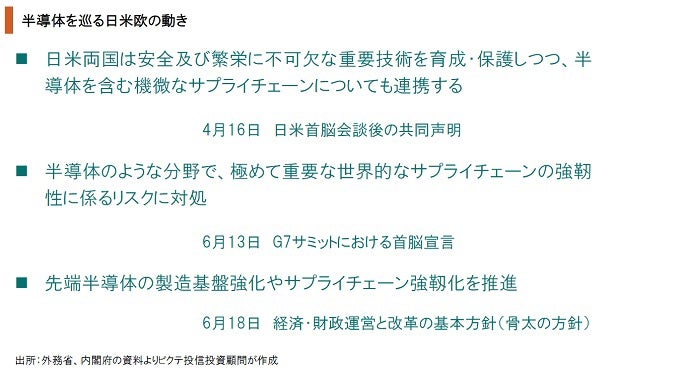 バイデン政権は、半導体の国際的なサプライチェーンに大きな懸念を持っている模様だ。その結果、4月16日の日米首脳会談、6月11~13日のG7首脳会議において、半導体は主要議題の1つになった。さらに、菅義偉内閣が6月18日に閣議決定した『経済・財政運営と改革の基本方針(骨太の方針)』にも、半導体製造基盤の強化が最重要課題として明記されている。