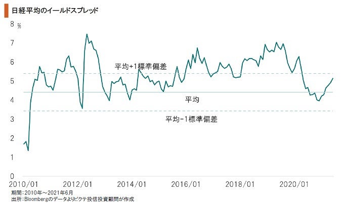 日経平均のイールドスプレッドを見ると、米国市場と異なり割高感はない。しかしながら、日本経済は新型コロナ禍からの立ち直りが遅れ、景気の停滞感が拭えない状態にある。一方、米国は新型コロナ禍で一時は厳しい社会状況に陥ったものの、そこからの復元力が極めて強い。結局、株価は足下のバリュエーションよりも、危機への対応力を評価しているのだろう。
