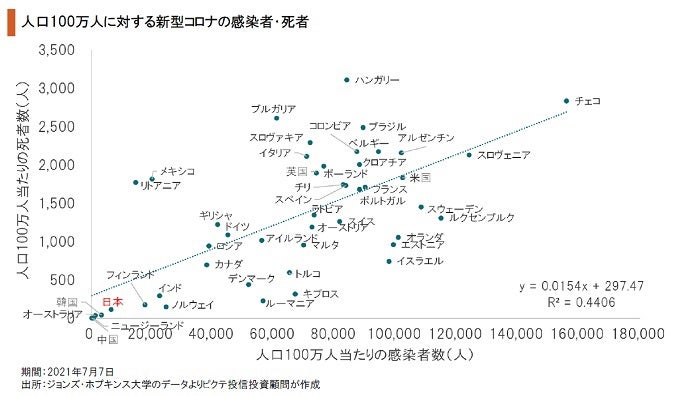 7月7日現在、人口100万人当たりの日本の新型コロナ感染者は累計で6,421人であり、米国の10万2,025人、ドイツの4万4,645人を大きく下回る。もっとも、これは中国や韓国、豪州も同様であり、アジア・大洋州地域の特徴と言えよう。日本政府による政策効果ではなく、地理的要因、遺伝的要因、風土、社会慣行など、疫学上の背景が存在すると考えられる。