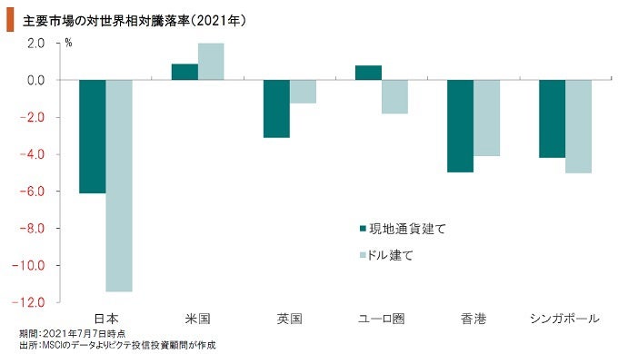 主要市場の世界指数に対する年初来相対騰落率を見ると、米国とユーロ圏がアウトパフォームする一方、日本株は大幅なアンダーパフォームだ。投資家が変化に乏しい日本ではなく、危機対応力を再確認させた米欧市場に魅力を感じているからだろう。ワクチン接種の遅れに象徴される菅政権の行政力の弱さは、日本株のパフォーマンスに大きく影響している模様だ。