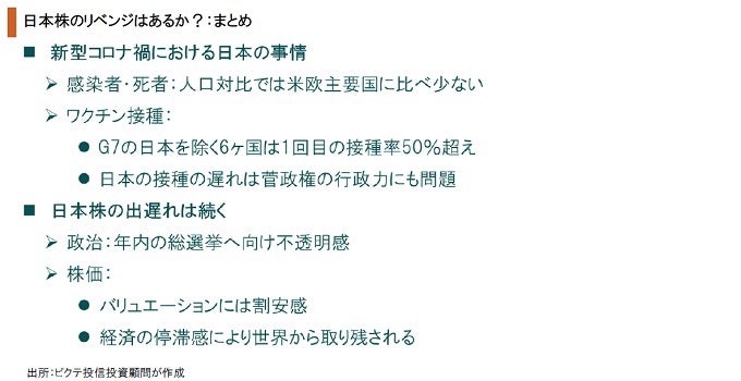 新型コロナ禍そのものに関して、他のアジア・大洋州に位置する国・地域同様、日本は米欧に比べ相対的に感染を抑制してきた。ただし、それは疫学上の何かが背景と見られ、必ずしも日本政府の行政力によるものではなさそうだ。むしろ、ワクチン接種の遅れにより、経済活動再開のペースは米欧主要国の後塵を拝しており、結果として内外の投資家は日本株への興味を失いつつあるのではないか。年内に予定される総選挙へ向け、菅政権は態勢の立て直しを迫られている。特にワクチン接種の加速は喫緊の課題と言え、その成否は総選挙の結果を大きく左右するだけでなく、景気のモメンタムを通じて株価にも影響を及ぼすだろう。