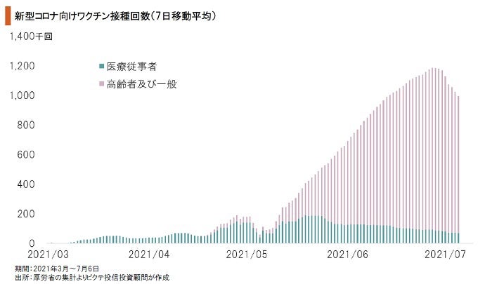 ワクチン接種に関し菅首相は1日100万回を目標に掲げた。6月中旬以降、このペースは概ね守られている。もっとも、順調に進んでも、集団免疫水準へ達するのは早くて年末だろう。むしろ、足下、モデルナ製ワクチンの輸入量不足、ファイザー製ワクチンの在庫偏在により、職域接種は開始早々に申請受付中止に追い込まれ、一部の自治体はワクチン不足に陥っている。