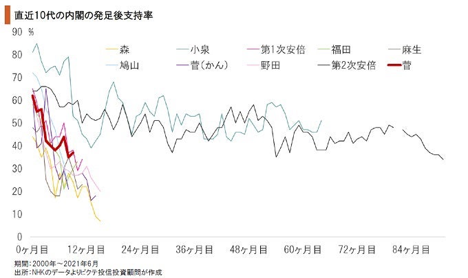 歴代内閣の発足からの支持率を追うと、長期政権となった小泉純一郎、2回目の安倍晋三両首相の場合、発足後1年間に亘り支持率は大きく低下しなかった。一方、短命に終わった他の内閣は、発足後間もなく支持率が急落している。菅内閣の支持率は急低下しており、年内に行われる総選挙へ向けて、態勢の立て直しには何らかのテコ入れ策が必要だろう。