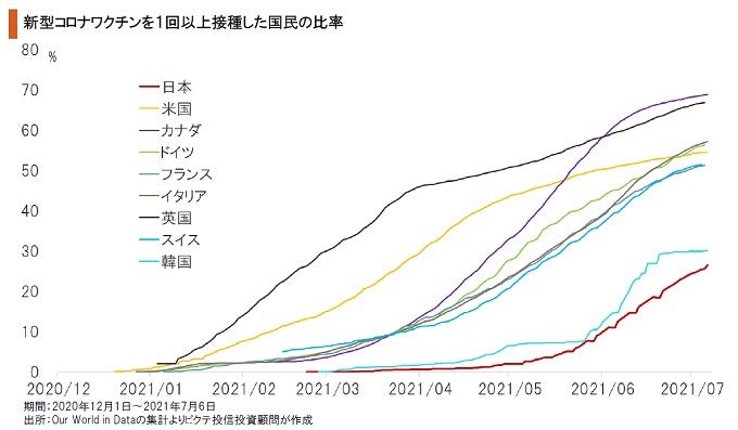 日本のワクチン接種はようやく軌道に乗りつつあるが、日本を除くG7各国は既に1回以上の接種を受けた国民が50%を超えた。日本の出遅れ感は否めず、その結果として経済活動の再開が進む米欧主要国に対し、日本では東京都が4回目の緊急事態宣言となった。これは、政府の行政力の問題が大きく、菅政権に対する国民の不満が高まりつつあると言えるだろう。