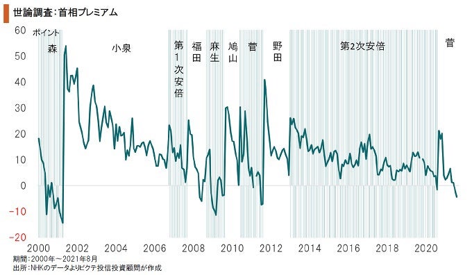 内閣支持率は、事実上、時の首相の人気で決まる。従って、与党内では内閣支持率から与党第1党の支持率を引いた「首相プレミアム」が重視されてきた。NHKの8月の調査によれば、首相プレミアムはマイナスゾーンへと落ち込んでおり、自民党周辺では「菅首相では総選挙を戦えない」との見方が台頭、総選挙前に同党総裁選の実施を求める声が強まっている模様だ。